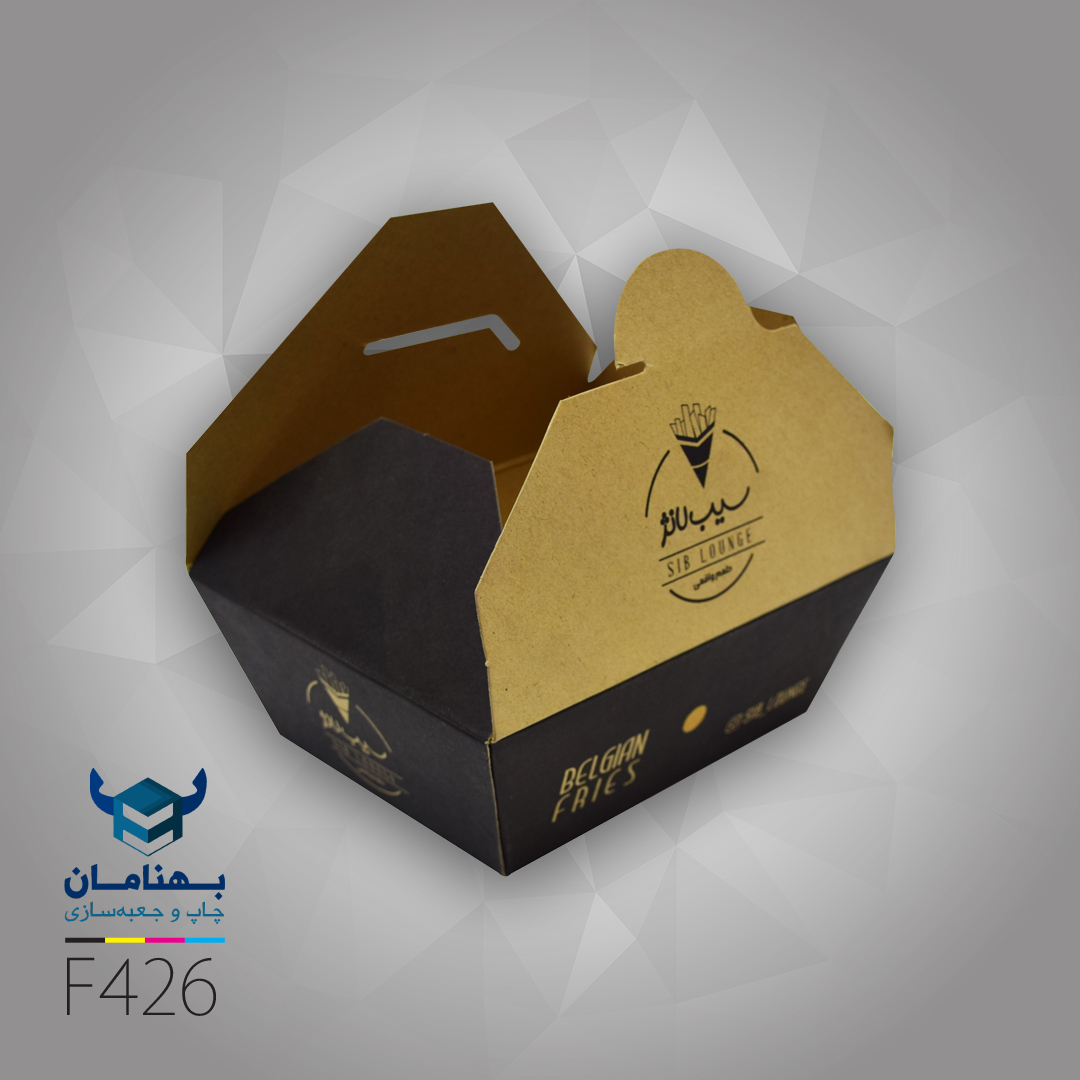 بسیاری از مشتریان به هنگام سفارش غذا به صورت بیرونبر سیبزمینی هم سفارش میدهند. بسیاری از فستفودها برای سفارشات بیرونبر و یا سفارشات داخلی از جعبه سیبزمینی هرمی 12 – کد F426 استفاده میکنند. این جعبه سیب زمینی از مقوای ایندربرد یا دوبلکس بهداشتی با چاپ افست تولید میشود. ابعاد آن به طول 14 عرض 12 و ارتفاع 6.5 میباشد. طراحی این نوع جعبه براساس درخواست مشتریان و هویت برندشان طراحی خواهد شد.
