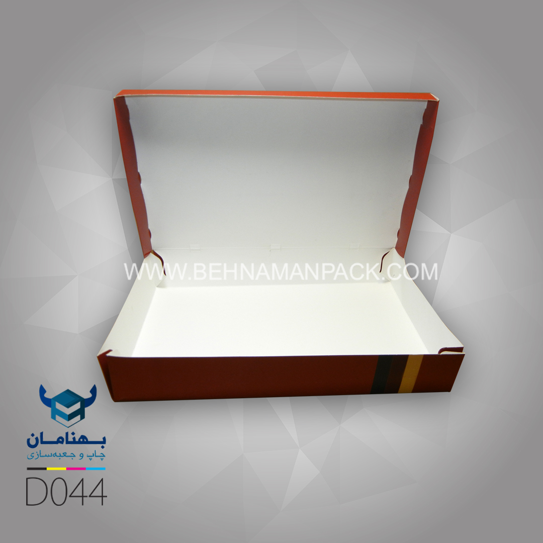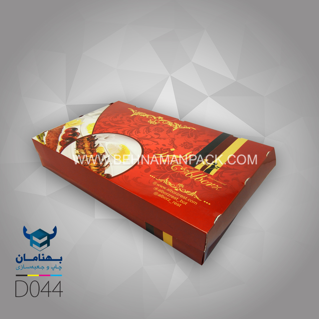 جنس جعبه غذا 40CM – کد D044 از مقوای ایندربرد و چاپ افست میباشد و میتوان با مقواهای دوبلکس بهداشتی، E فلوت و با چاپ افست و فلکسو نیز تولید کرد.