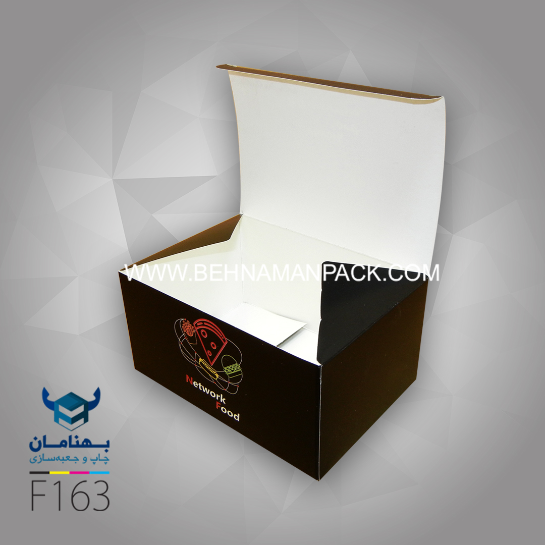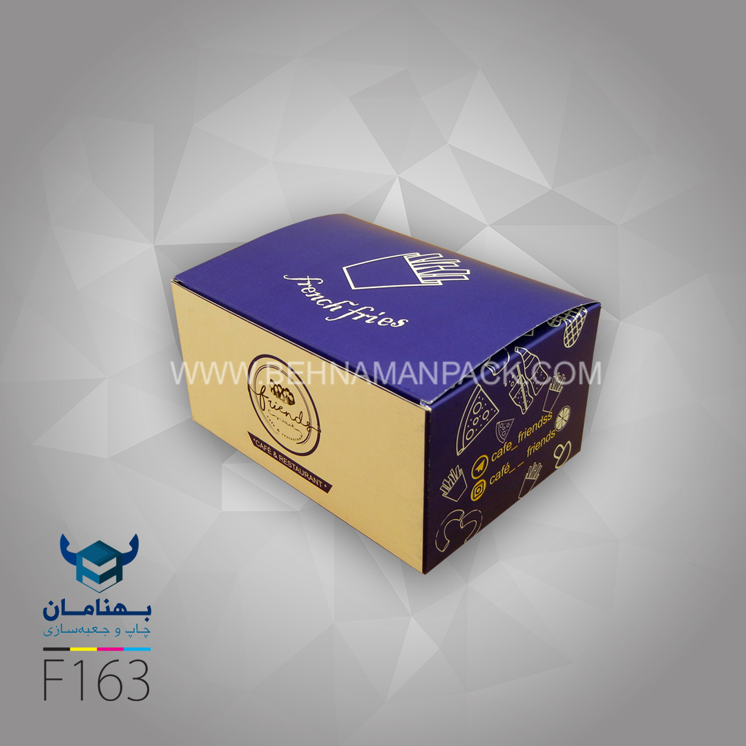 یکی از محبوبترین و پرطرفدارترین غذاهای فستفودی سیب زمینی است به گونه ای که برخی از فست فودی ها به صورت تخصصی و تک محصول سیب زمینی سرو میکنند.بسیاری از فستفودها برای سفارشات بیرونبر و یا سفارشات داخلی از جعبه سیبزمینی درب دارویی 14 – کد F163 استفاده میکنند. جنس این نوع جعبه سیب زمینی از مقوای ایندربرد و یا دوبلکس بهداشتی با چاپ افست تولید میشود. ابعاد جعبه سیب زمینی به طول 14، عرض 10 و ارتفاع 7 است. طراحی و نوع چاپ براساس هویت برند و سلیقه مشتریان صورت میگیرد.