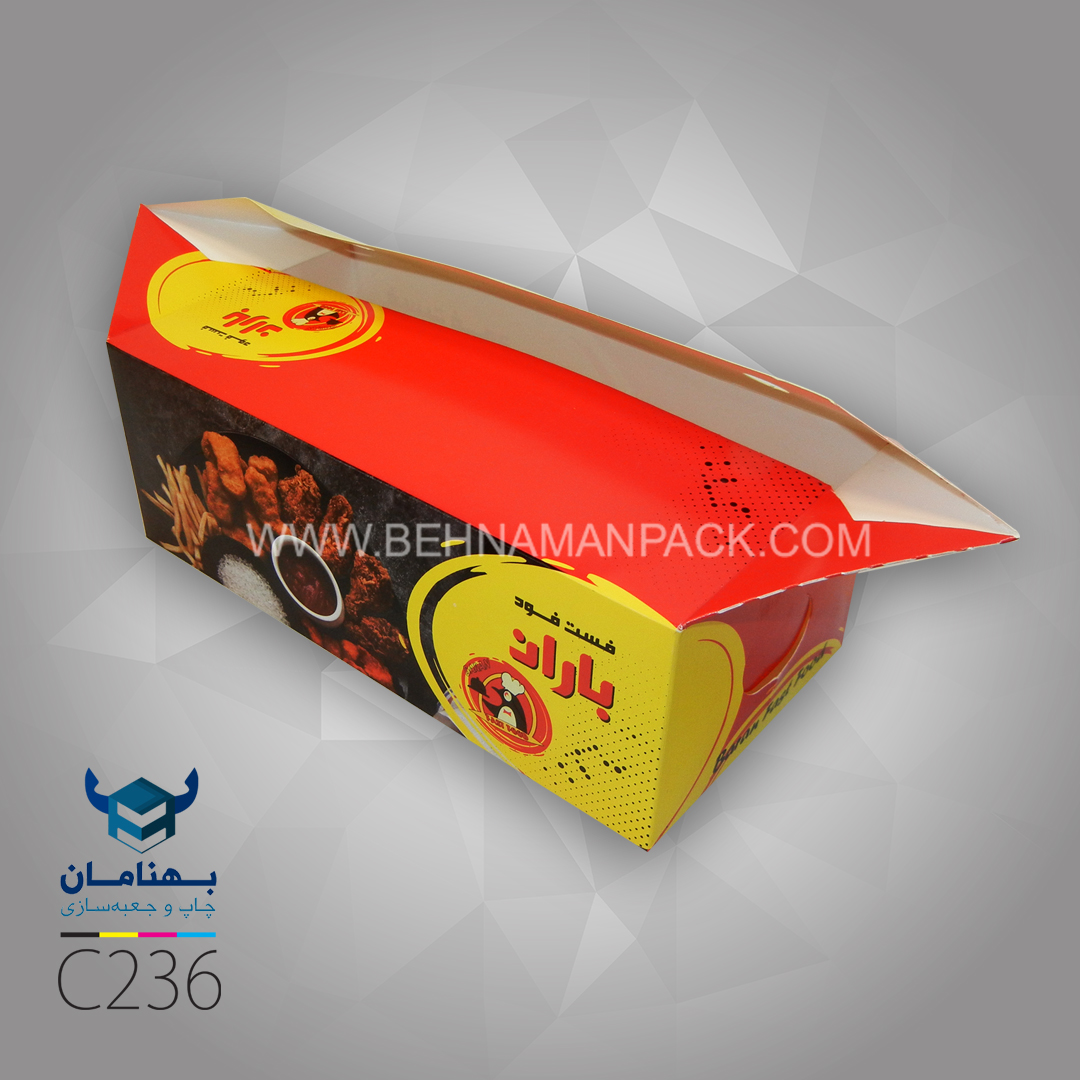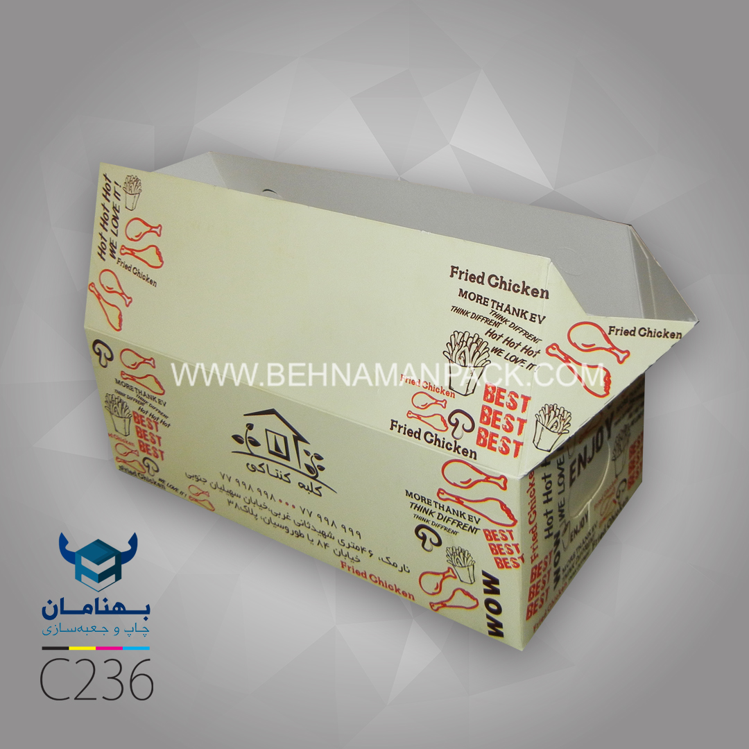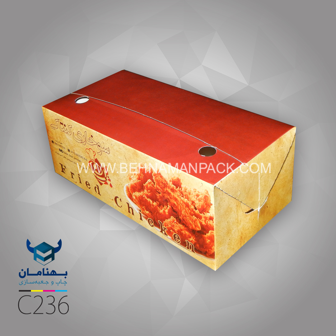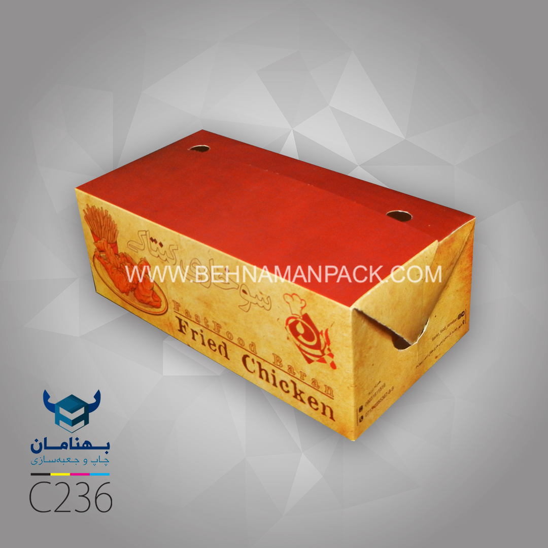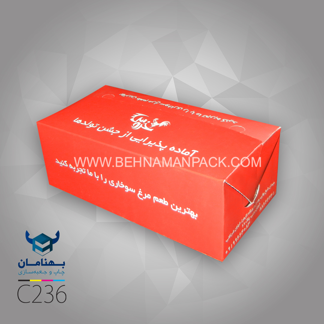 یکی از محبوبترین و پرطرفدارترین غذاهای فستفودی مرغ سوخاری است. بسیاری از فستفودها برای سفارشات بیرونبر و یا سفارشات داخلی از این نوع جعبه سوخاری استفاده میکنند. فضای این نوع جعبه امکان قرارگیری سبزمینی در کنار مرغ سوخاری را برای شما فراهم میکند. جنس این نوع جعبه سوخاری از مقوای دوبلکس بهداشتی و یا ایندربرد با چاپ افست تولید میشود. ابعاد جعبه سوخاری قفلشو بیرونبر به طول 22.5، عرض 11.5 و ارتفاع 8 است. طراحی و نوع چاپ براساس هویت برند و سلیقه مشتریان صورت میگیرد.