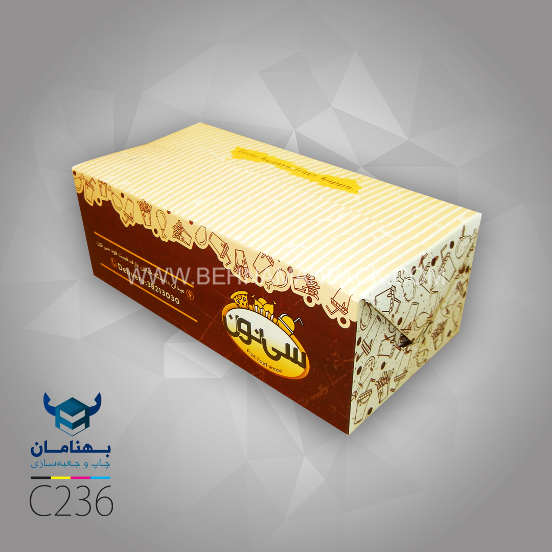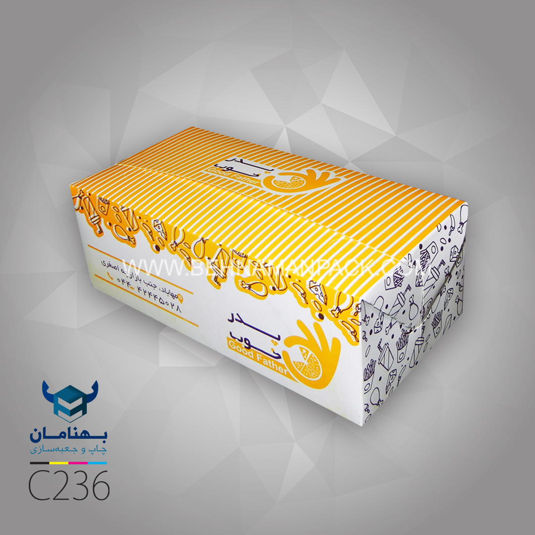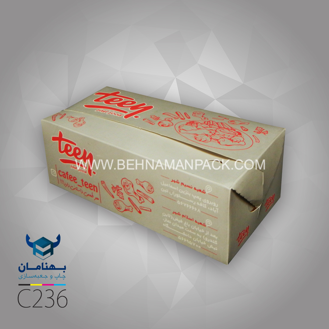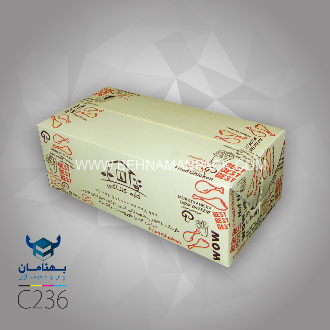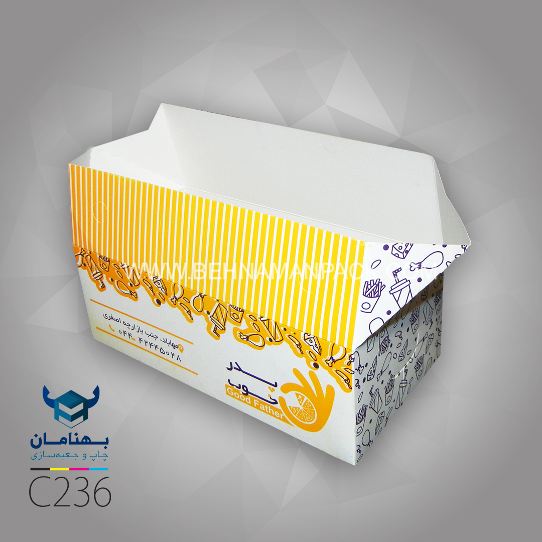 یکی از محبوبترین و پرطرفدارترین غذاهای فستفودی مرغ سوخاری است. بسیاری از فستفودها برای سفارشات بیرونبر و یا سفارشات داخلی از این نوع جعبه سوخاری استفاده میکنند. فضای این نوع جعبه امکان قرارگیری سبزمینی در کنار مرغ سوخاری را برای شما فراهم میکند. جنس این نوع جعبه سوخاری از مقوای دوبلکس بهداشتی و یا ایندربرد با چاپ افست تولید میشود. ابعاد جعبه سوخاری قفلشو بیرونبر به طول 22.5، عرض 11.5 و ارتفاع 8 است. طراحی و نوع چاپ براساس هویت برند و سلیقه مشتریان صورت میگیرد.